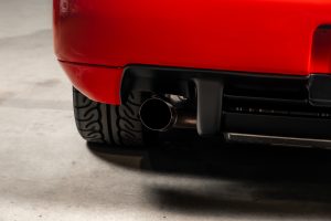• This example is finished in the vibrant shade of Formula Red with a contrasting gloss-black roof, over a black Alcantara-trimmed cabin, featuring contrasting red stitching, red suede cloth-trimmed Recaro bucket seats, and satin-grey trim inlays.